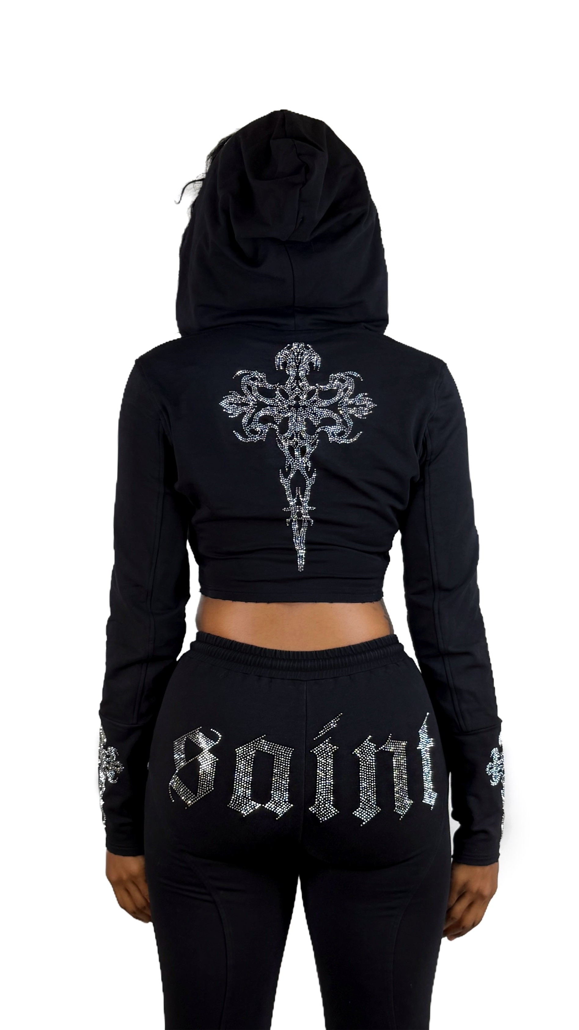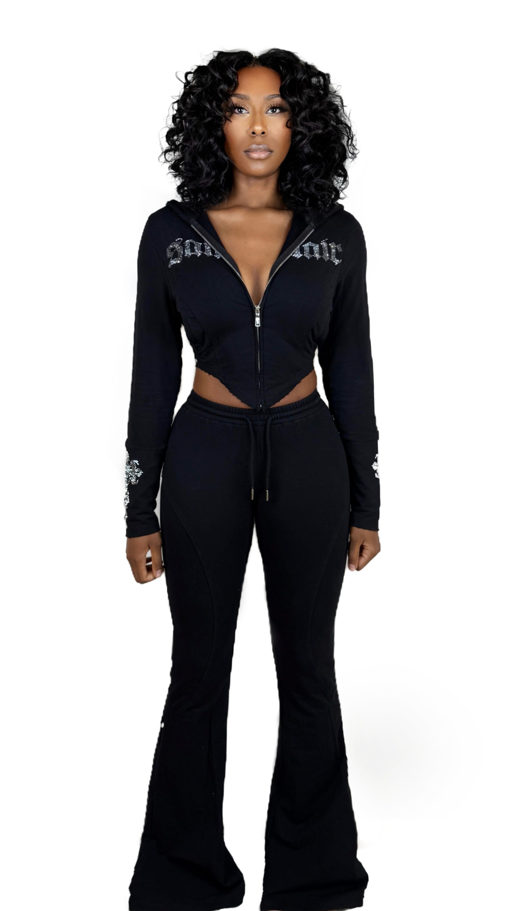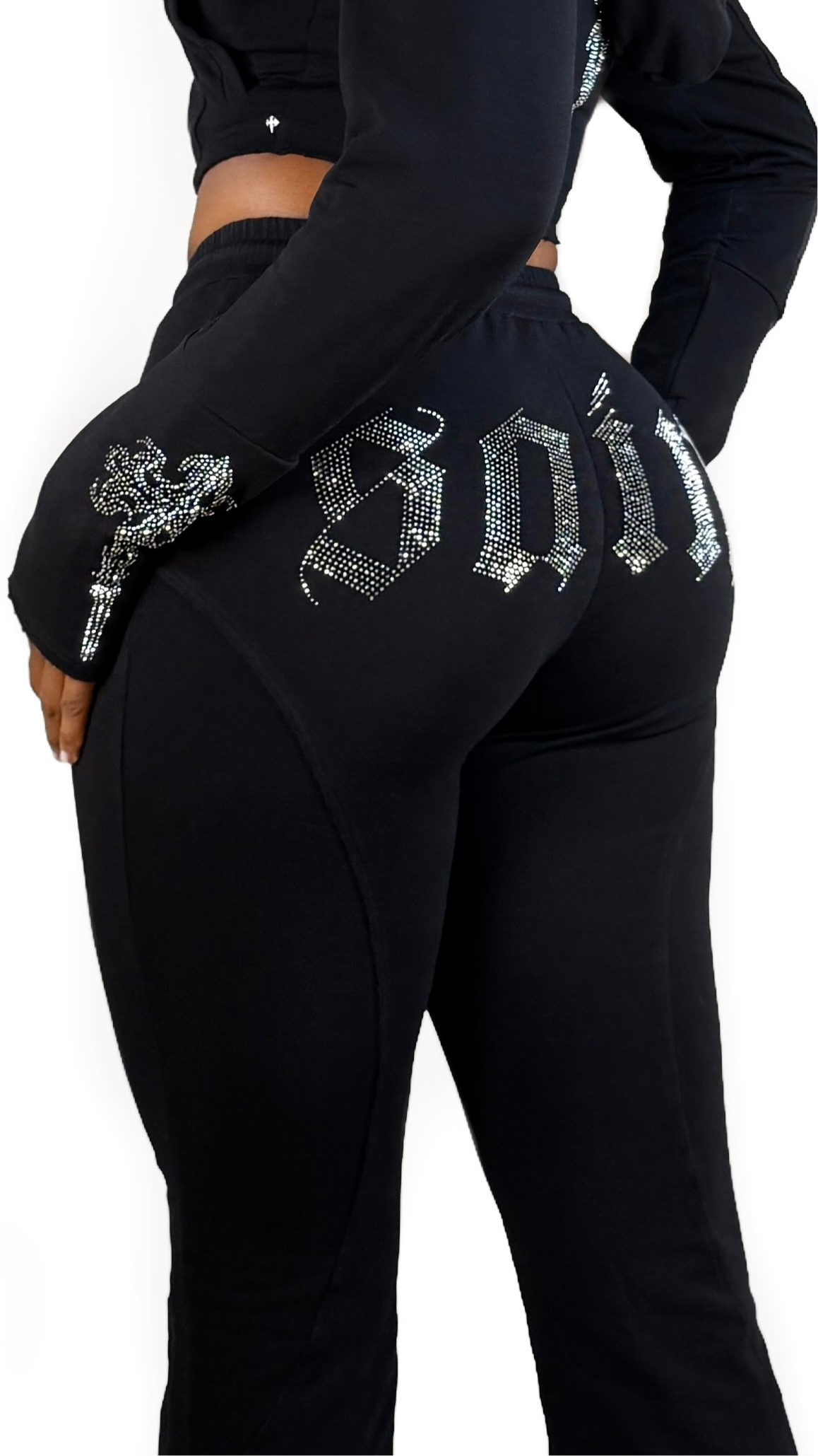 Black stretch French Terry pants with a soft feel, designed for comfort in travel and everyday wear. Flared legs create a sleek, elongated line, finished with chrome rhinestone logo detailing for an elevated edge. Pair with the Saint Hoodie to complete the pictured look.